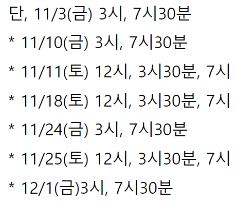 | 오후 7시30분 | 오후 7시30분 | 오후 7시30분 | 오후 3시30분, 오후 7시 | 오후 2시, 오후 5시30분 |