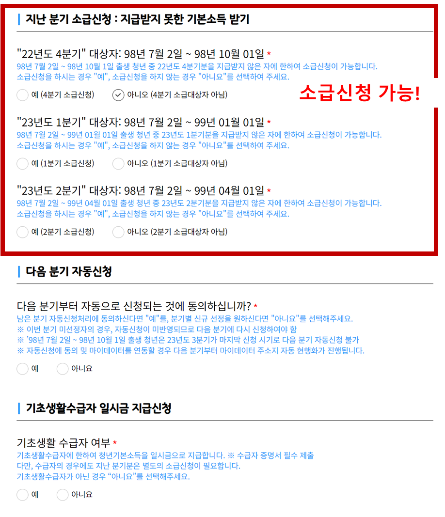 그럼 마지막 개인정보 입력란에서 위 사진처럼 '지난분기 소급신청'을 클릭할 수 있습니다~!