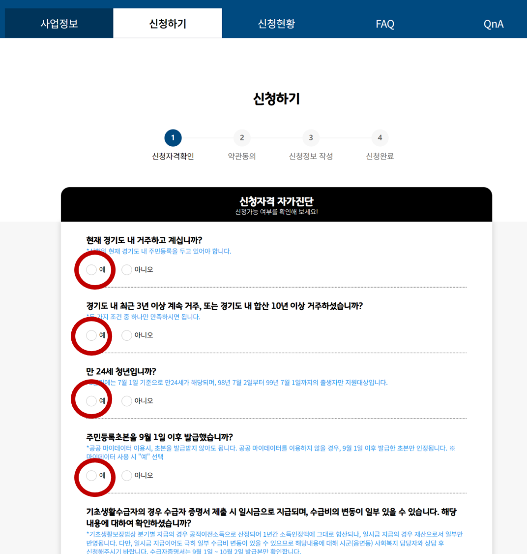 모두 해당하는 분들은 모두 '예'를 눌러주세요.